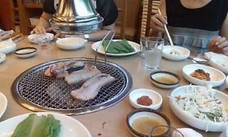 二日目の夕食サムギョプルです。黒豚の厚切りを焼いてサンチュという野菜に巻いてゴマ油や玉ねぎなどと一緒に食べます。マシッソヨ(美味しい)